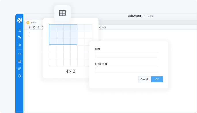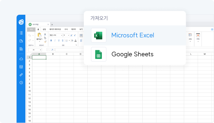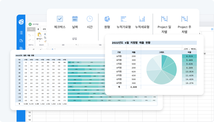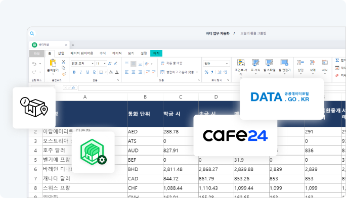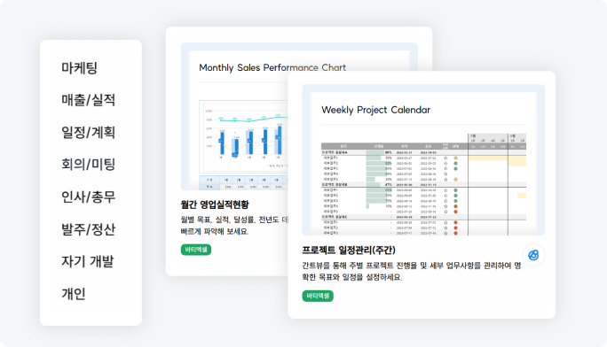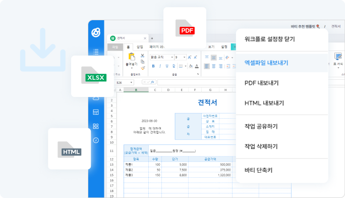등”으로 구성이 되어져 있으며, 바티 내에서 제공되는 템플릿을 편집하는 웹 엑셀 소프트웨어(이하 '웹 엑셀'이라 한다)를 통해 편집이 가능합니다. 또한